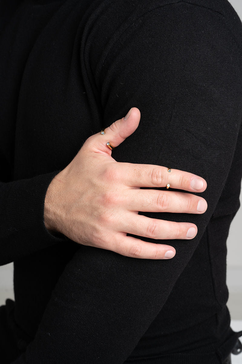 The Sacred Ring in "Pater" size is a hand made elegant but daring piece of jewelry art. Equipped with two Swarovski Aquamarine crystals and a strong 18K Gold plating, this adjustable stainless steel Ring will lend you a special touch and irresistible attractiveness.